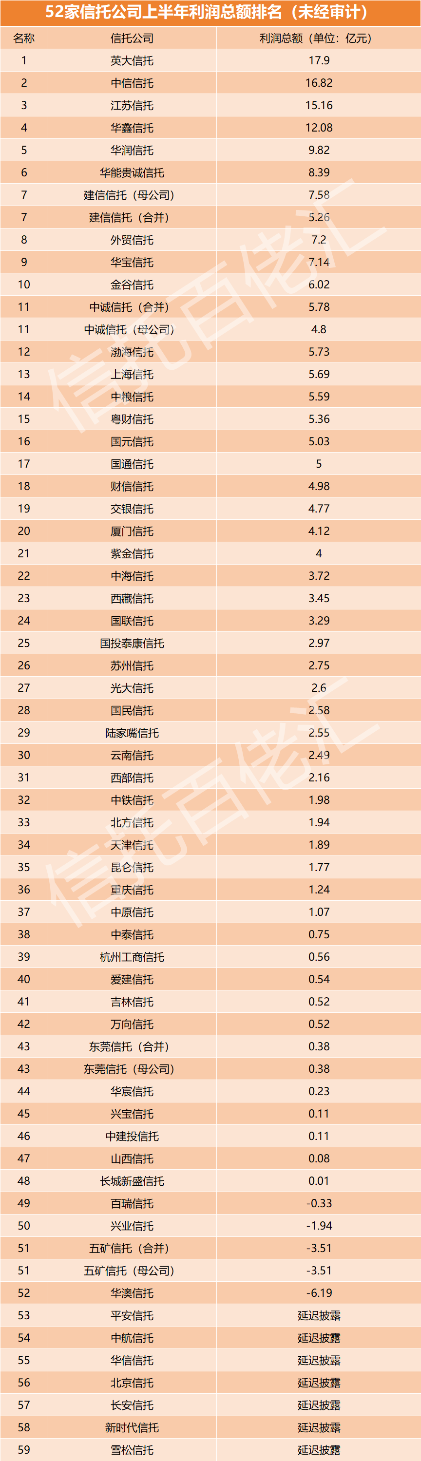 记者统计,上半年盈利的公司中有11家利润总额不足1亿元,另有百瑞信托、兴业信托、五矿信托和华澳信托等4家公司出现亏损。此外,中航信托、北京信托、雪松信托、长安信托等7家公司尚未发布数据。